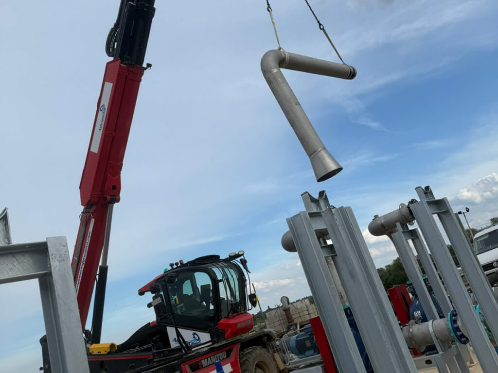 The installation was executed using our own roto telehandler and certified lifting operators, enabling precise handling and positioning of large stainless-steel assemblies. Selected pipe sections were insulated and aluminium-cladded where required, while remaining sections were left exposed for operational visibility and ease of inspection.